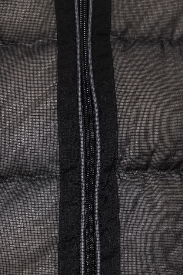 Black and grey down jacket from Dsquared2. Crafted from textured fabric with a check pattern, this garment features a two-way zip, drawstring hood, two front zip pockets, sleeve patch with a logo and long sleeves with ribbed cuffs.