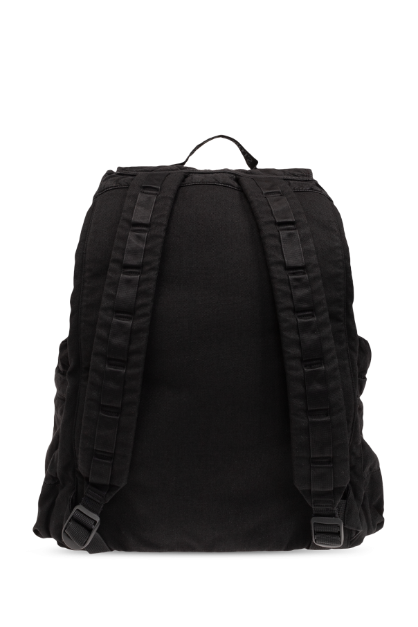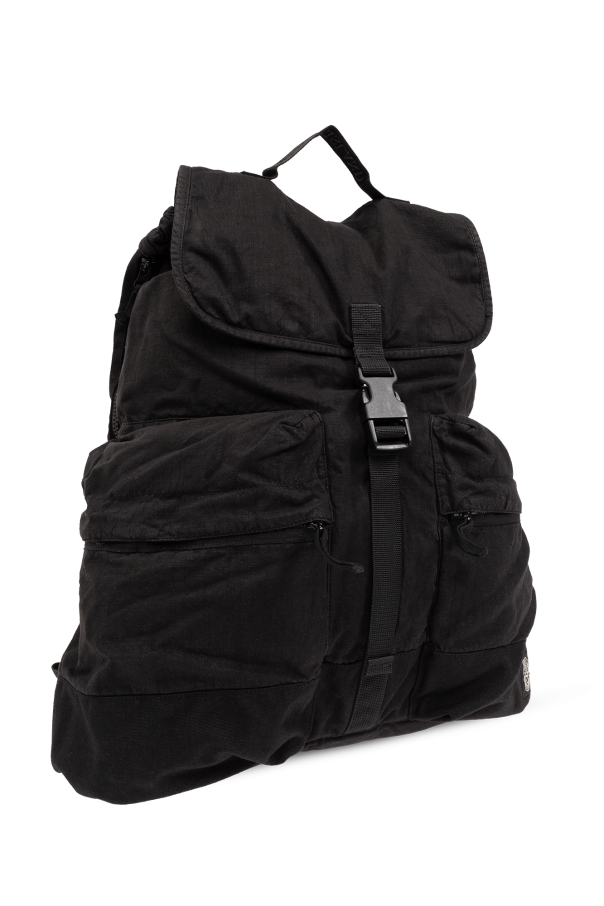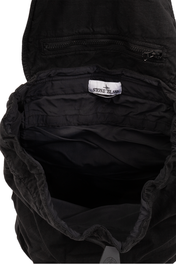 Black backpack from Stone Island. Made of linen, this design features a buckle strap, white and black logo patch, two zip pockets, black metal hardware and one internal compartment with a velcro pocket.