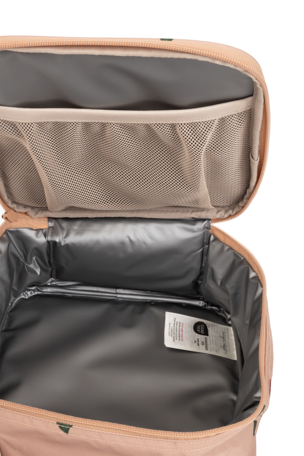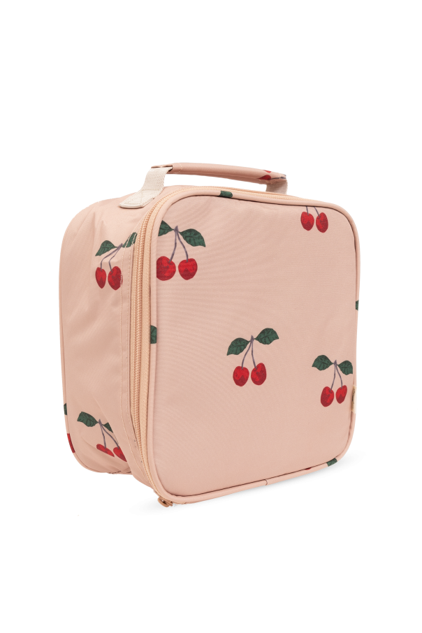Introducing the Konges Sløjd Thermal Lunch Bag, a delightful and practical accessory for your child\'s daily adventures. Crafted from 100% polyester, this charming pink bag is adorned with a playful pattern of red cherries with green leaves, bringing a touch of whimsy to lunchtime. The bag\'s sleek, rectangular shape with rounded corners, and a convenient top handle, make it easy for little hands to carry. Its exterior, which appears smooth and potentially waterproof, ensures durability and easy cleaning - a must-have for any child\'s accessory. The small side label hints at the designer\'s attention to detail, though the exact logo remains a subtle mystery, adding to its exclusive appeal. More than just an eye-catching design, this thermal lunch bag boasts insulation properties that help maintain the temperature of stored food items, making it perfect for long days at school or kindergarten. While the closure type is not visible, one can anticipate a secure fastening mechanism, likely a zipper, to keep contents fresh and at the desired temperature. This product proudly carries the OEKO-TEX® STANDARD 100, class 2 certification, ensuring it meets high safety and environmental standards. Inside, it features a mesh compartment and a slide-in pocket, offering organized space for snacks and utensils. Why Choose This Product? Charming and child-friendly design with a vibrant cherry pattern. Constructed from durable, easy-to-clean 100% polyester. Insulation properties keep food fresh and cool. Convenient design with a top handle for easy carrying. OEKO-TEX® certified, ensuring product safety and quality. Interior mesh compartment and pocket for organization.