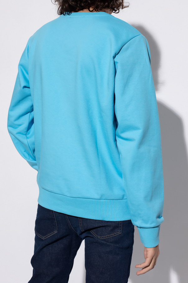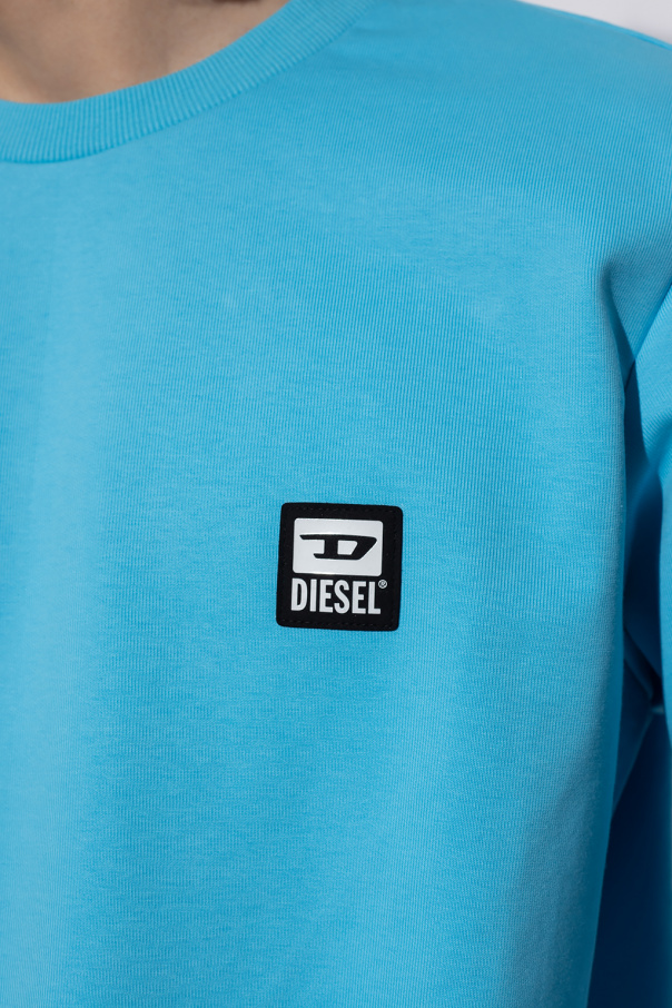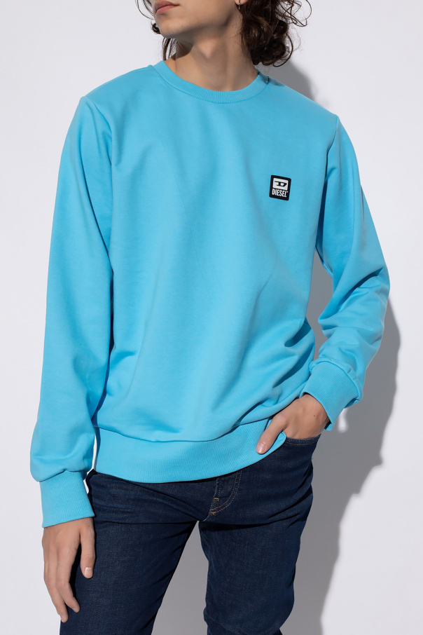 Blue crewneck sweatshirt from Diesel. Crafted from cotton jersey, this style showcases a black and white logo patch and ribbed trims on the collar, bottom hem and cuffs.