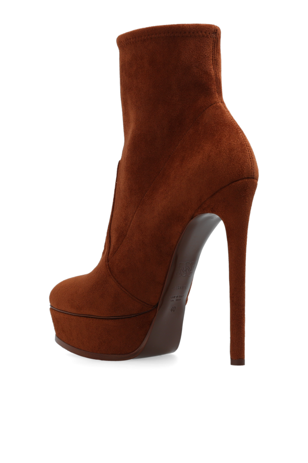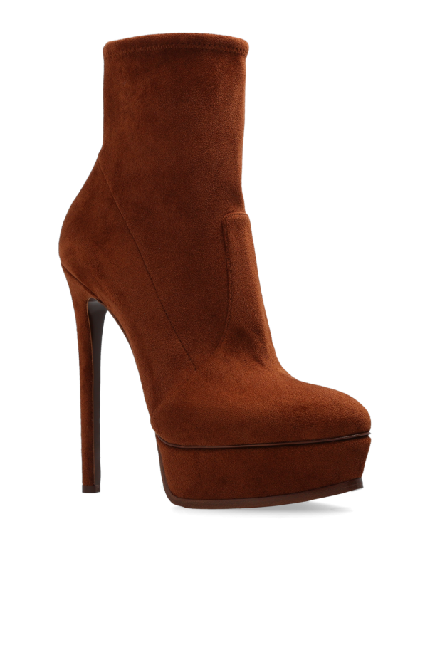 Brown ‘Flora’ platform ankle boots from Casadei. Made of suede, this slip-on pair features an almond toe and brown leather sole.