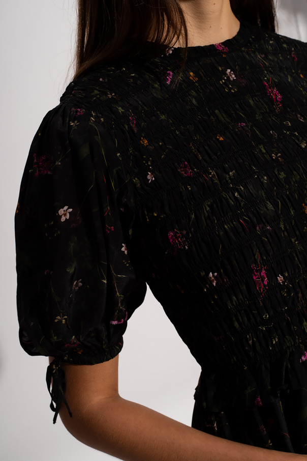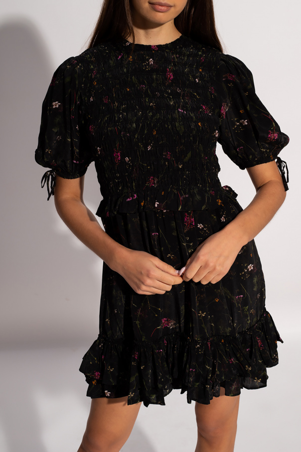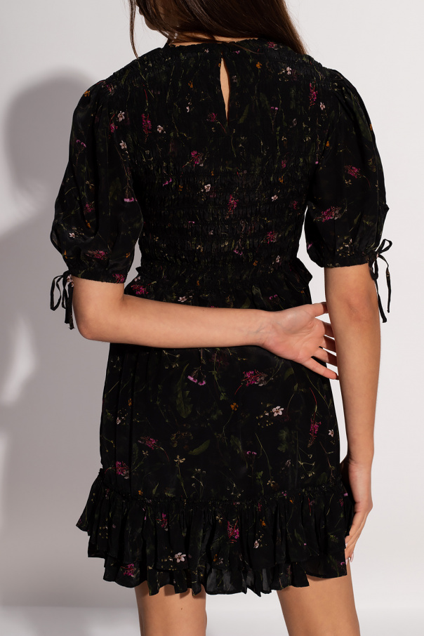 Black dress from ‘Jaya’ dress AllSaints. Fastened at the back with buttons, this round neck design features a multicolored floral motif, ruched top, short sleeves with ties and a ruffled hem.