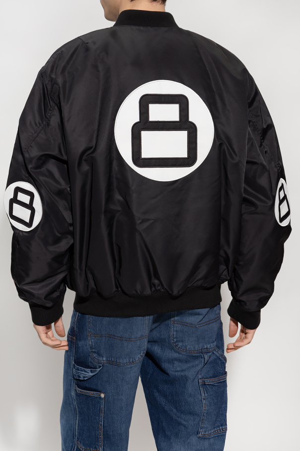 Black bomber jacket with light insulation from Heron Preston. Fastened with a zip, this garment features white and black patches, logo detail, snap-fastened flap pocket, zip pocket and ribbed trims at the neck, hem and cuffs.