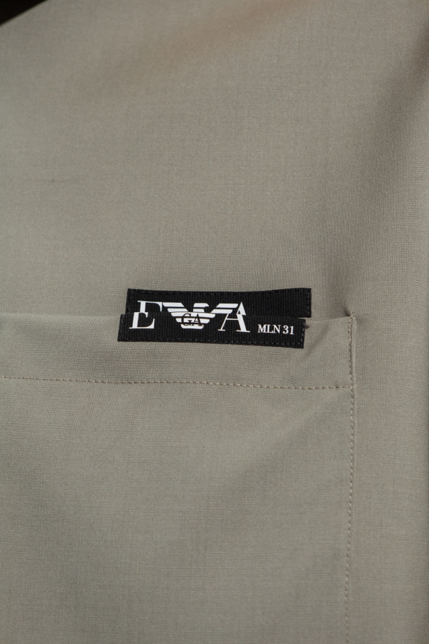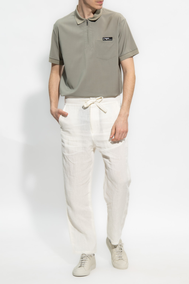 Grey polo shirt from Emporio Armani. Made of wool, this style features a zipped collar, short sleeves and a frontal pocket a accompanied with a black and white logo patch.