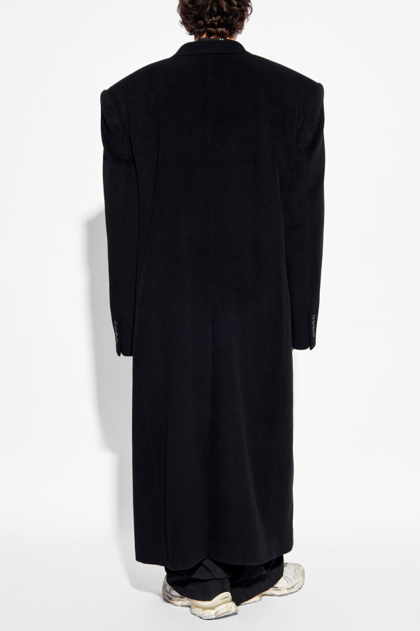 Black coat from Balenciaga. Made from a wool and cashmere blend, this style features a single back vent, peak lapels, front button fastenings, one welt pocket, two flapped pockets and long sleeves.