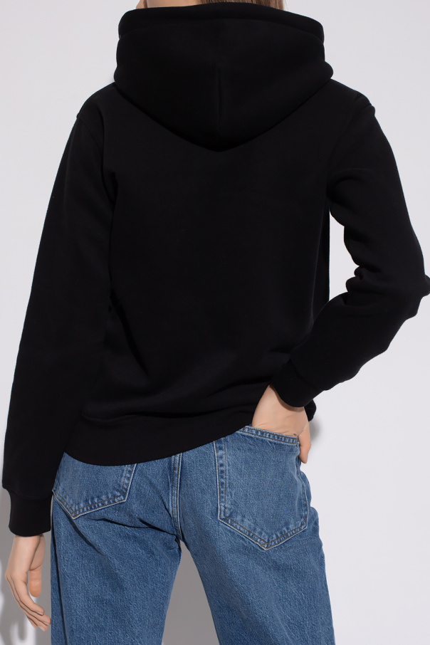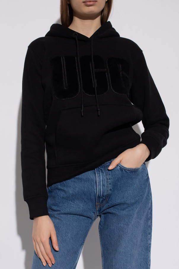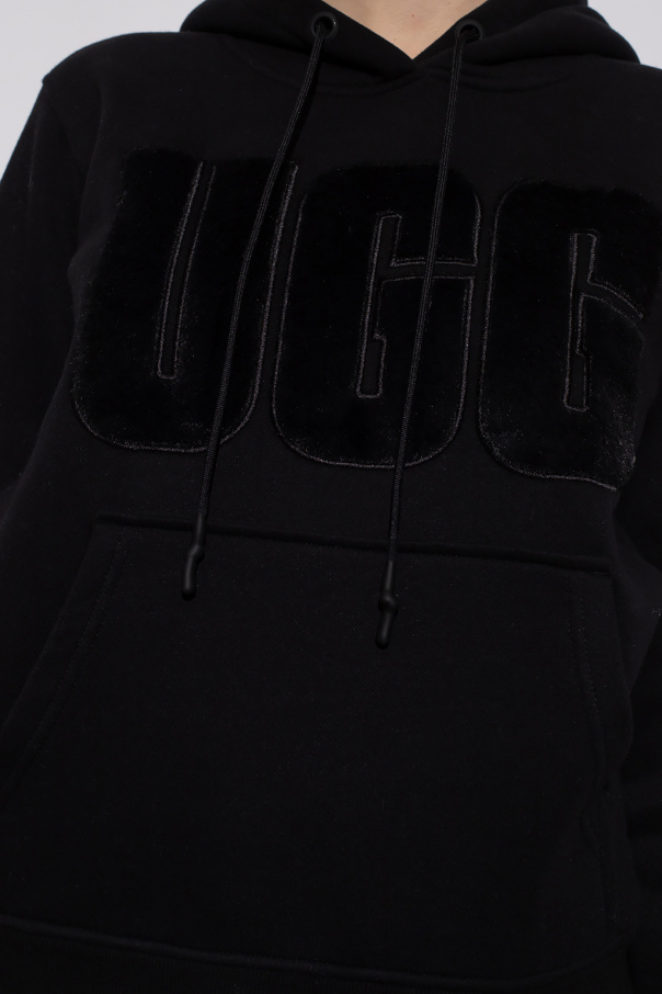 Black ‘Rey’ hoodie from UGG. This garment features a logo with a faux fur finish, drawstring hood, front pocket and ribbed trims at the hem and cuffs.