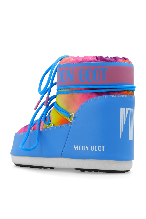 Multicolored ‘Icon Low Tie Dye’ waterproof snow boots from Moon Boot. Set on a black and white rubber sole with suction pads that offer serious ground control, this pair features criss-cross tubular laces (not to be used to tighten boots), elasticated cuffs, tie-dye motif, a logo and silver-tone metal hardware. Inspired by the peculiar shape and technology of the astronauts\' boots, the iconic style was designed in 1969 after the first Moon landing.