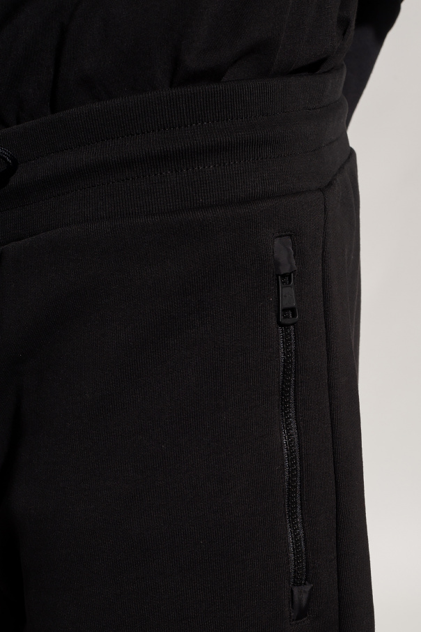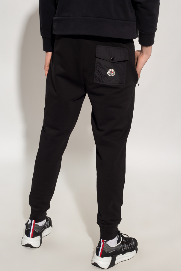 Black sweatpants from Moncler. Made of cotton, this pair features a drawstring waistband, two zip pockets, one flapped pocket, elasticated cuffs and a cream, navy blue and red logo patch at the back.