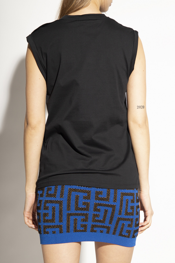 Black sleeveless T-shirt from Balmain. Crafted from cotton, this style features an elasticated collar, decorative gold-tone buttons on the shoulder and a printed white logo on the front.