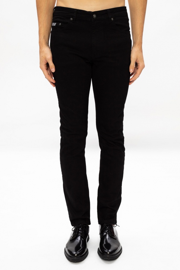 Black jeans from Versace Jeans Couture. Fastened with a zip and button, this tapered leg design features a logo patch, two front pockets and two back pockets.
