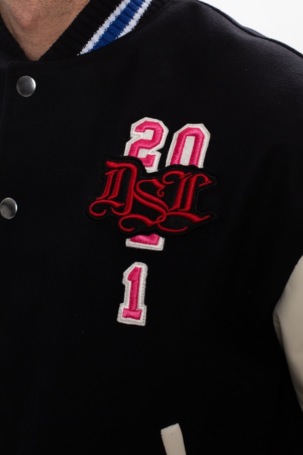 Black bomber jacket from Diesel. Enriched with colourful ‘Brave CNY 2021’ patches, this wool-crafted style fastens via snap-buttons and employs two front welt pockets, a blue, black and white stripe rib-knit trims at the collar, hem and cuffs and long sleeves in contrasting cream cow leather.