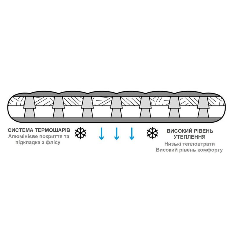 - Материал: Nylon 20D Ripstop TPU Coated with Heat Reflective Layer - ультралегкий и чрезвычайно прочный и износостойкий синтетический материал с толщиной нити 20D, с укрепляющей структурой Ripstop и устойчивым TPU покрытием, непроницаемым для влаги и воздуха. Имеет внутреннюю термоотражающую подкладку из алюминия и флиса.