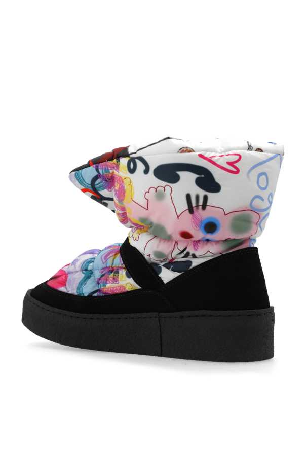 White and black snow boots from Khrisjoy. Made from quilted material decorated with a colourful, graffiti-inspired pattern, this model sits on a black rubber sole and features an adjustable strap with a snap buckle and an embossed logo on the back.
