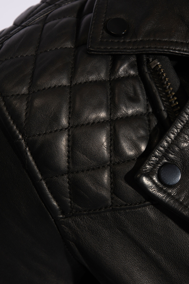 Black ‘Conroy’ jacket from AllSaints. Made of lamb leather. Fastened with zip. Embellished with quilted shoulder paneling. It also features 2 zipped pockets on the front.