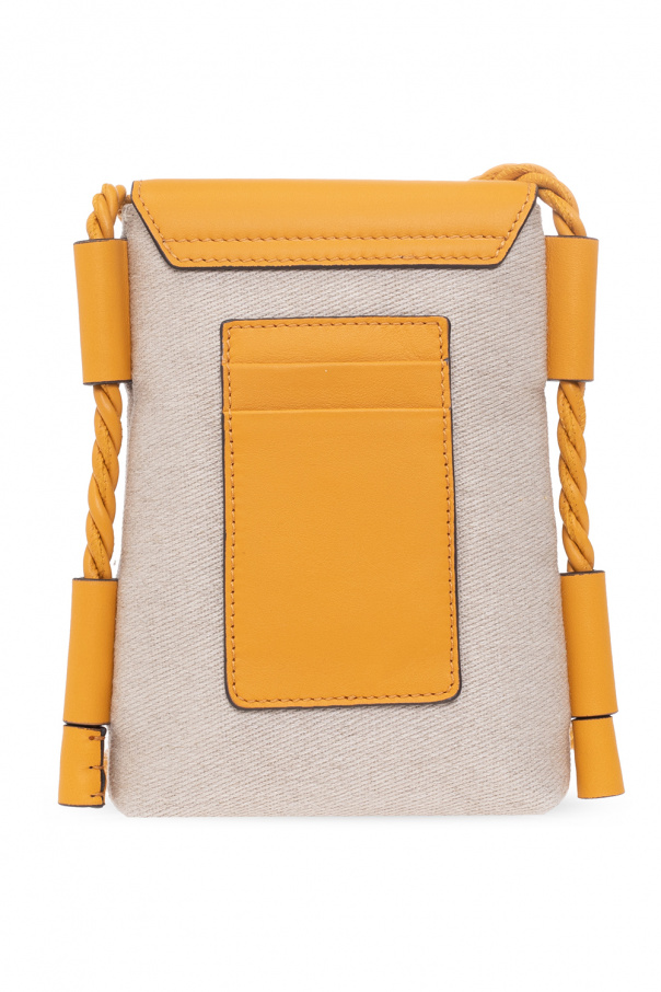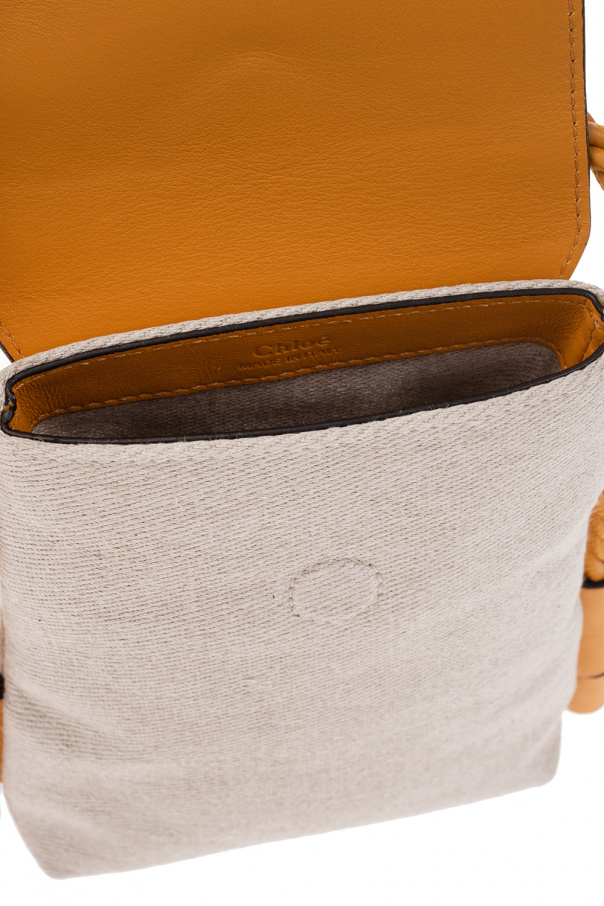 Orange and beige phone holder from Chloé. Crafted from linen with calf leather trims, this model features a magnetic closure, embossed logo, two card slots at the back, adjustable woven strap, one internal compartment and gold-tone metal hardware.
