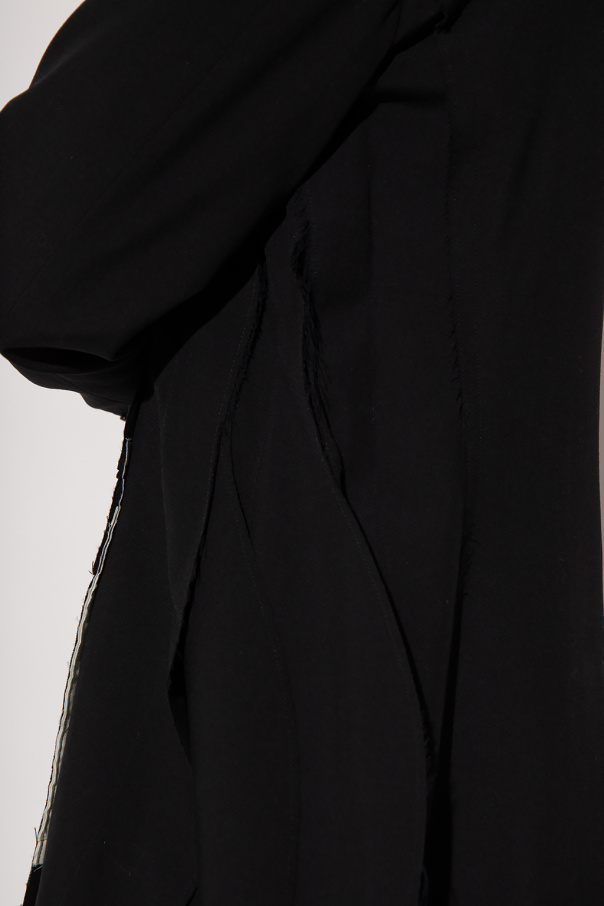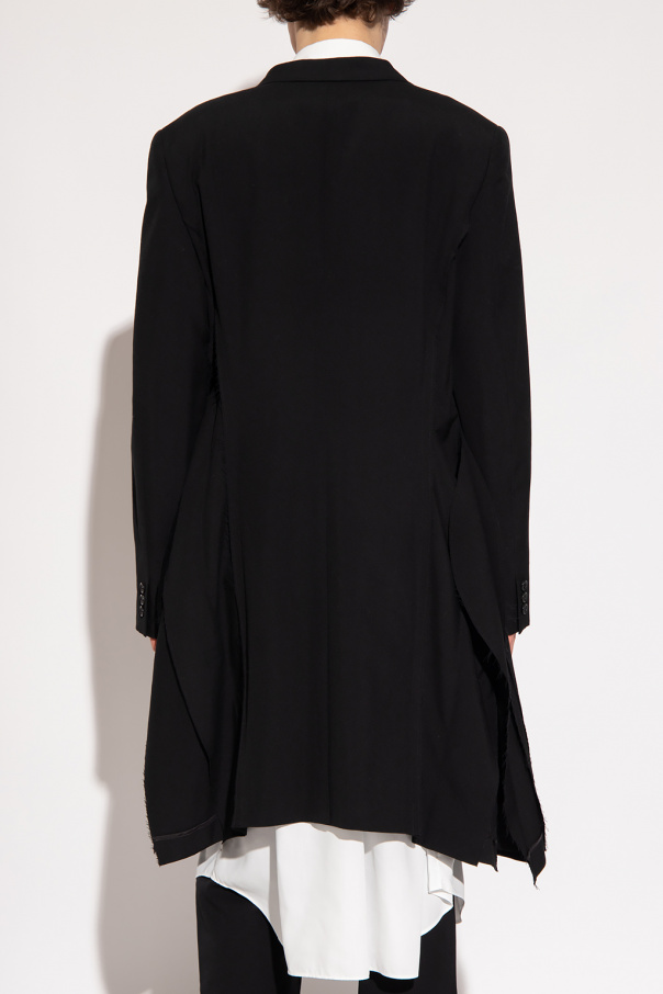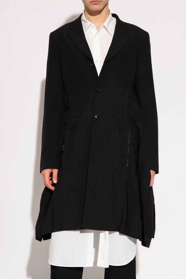 Black coat with notch lapels from Comme des Garcons Homme Plus. Made of wool, this garment features button fastenings, vintage effect, front pocket, long sleeves and single rear vent.