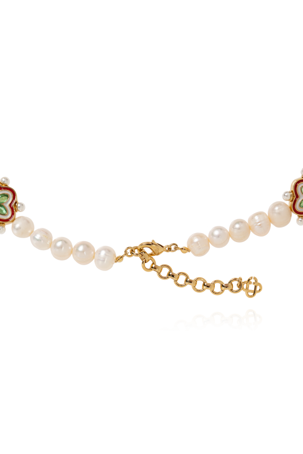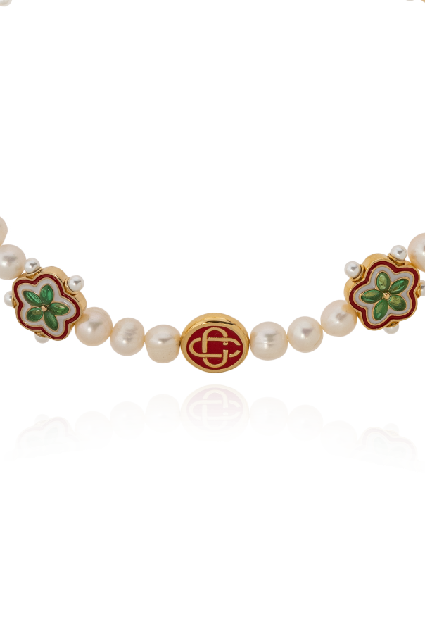 Introducing the Casablanca Pearl Necklace: a masterpiece of elegance and sophistication. This exquisite piece is composed of lustrous, white pearls, each meticulously selected for its classic, round shape and smooth, shimmering surface. The pearls are interlinked, creating a continuous, graceful strand that encapsulates the beauty of the natural world or the highest quality of imitation. Embedded within this pristine string of pearls are decorative elements shaped like flowers, adding a splash of color with green petals, red accents, and golden outlines. The necklace features a centrally located, larger element adorned with the iconic logo, round in shape, and finished in a striking red with gold details. This signature piece not only serves as a focal point but also as a testament to the distinguished brand Casablanca. The necklace is complemented by a golden chain near the clasp, indicating an adjustable design to ensure a perfect fit for any wearer. The traditional lobster claw clasp adds a touch of classic practicality, making it both a versatile and stylish choice. Crafted from glass, enamel, and gold-plated brass, this necklace is a symphony of white and gold, blending classic pearl elegance with bold, modern accents. It stands as a unique accessory that can elevate any attire, embodying the blend of traditional charm and contemporary boldness. Why Purchase This Product? Signature Design: Uniquely incorporates Casablanca\'s elegant aesthetic with modern flair. Adjustable Comfort: Features an adjustable gold chain and a lobster claw clasp for a customizable fit. Exquisite Craftsmanship: Made from high-quality materials such as glass, enamel, and gold-plated brass, ensuring durability and lasting beauty. Versatile Elegance: Perfect for both formal and casual occasions, adding a touch of sophistication to any outfit.