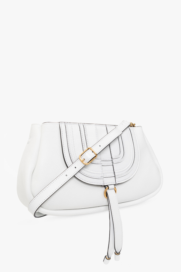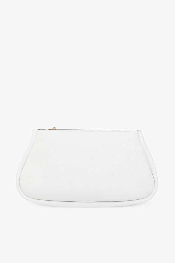 White ‘Clutch’ shoulder bag from Chloé. Made of calf leather, this model is complete with a zip fastening, front pocket with a decorative closure, stitching details, embossed logo, detachable and adjustable shoulder strap, black trimming and lining, one internal compartment and gold-tone metal hardware.