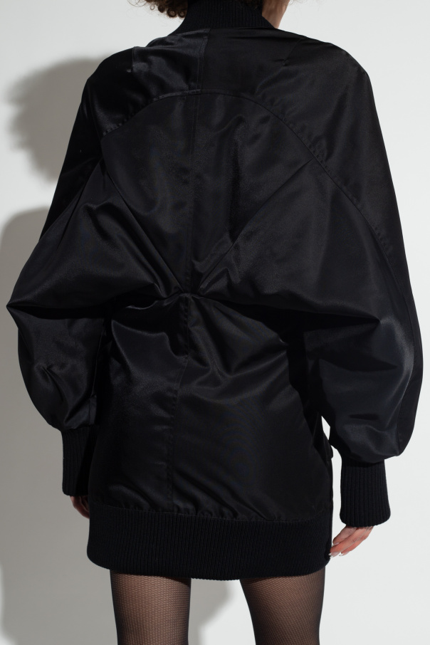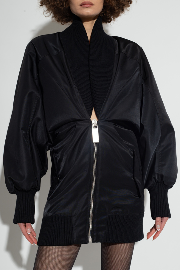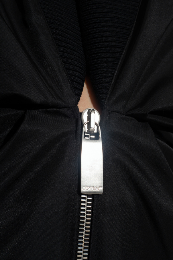 Black jacket from Off-White. Crafted from combined materials, this style features a relaxed-fitting upper part, a plunging V-neckline, a silver-tone zip fastening with a logo-engraved application, two flapped pockets with snaps, long sleeves and elasticized trims on the collar, bottom hem and cuffs.