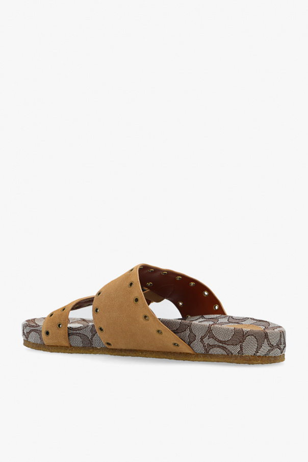 Beige ‘Ally’ slides from Coach. Crafted from suede, this design features a buckle strap, metal rings in antique gold-tone and sole with a monogram pattern and beige rubber trims.
