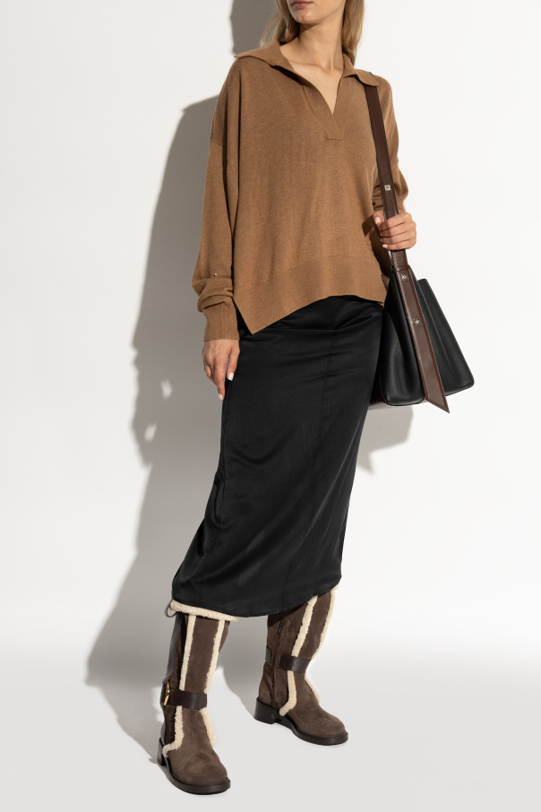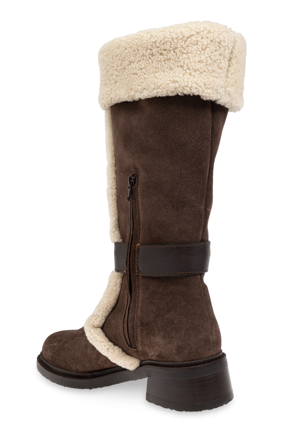 Introducing the exclusive Ring Boots from the renowned See By Chloé collection, a true epitome of luxury and elegance. These knee-high boots, crafted in a sophisticated brown hue, are designed to elevate your style with their unique features and premium materials. Constructed from fine suede, the Ring Boots boast a wide shaft that can be gracefully folded outward, revealing a plush, cream-colored fur lining. This sumptuous fur not only adds a touch of warmth but also accentuates the boots\' exquisite design, visible along the edges and external seams. The boots are thoughtfully adorned with sleek, brown leather straps, elegantly fastened with golden, circular metal rings. A discreet zipper on the inner side ensures ease of wear, while the designer\'s logo subtly embellishes one of the straps, signifying authenticity and prestige. With a medium-height, broad heel, these boots offer both stability and comfort, making them ideal for all-day wear. The classic, elegant silhouette combined with luxurious materials and meticulous attention to detail makes the Ring Boots a timeless addition to any wardrobe. Why Choose These Boots? Exquisite Design: Classic knee-high style with luxurious details. Premium Materials: High-quality suede and leather, with a cozy fur lining. Comfort and Stability: Medium-height heel for all-day wear. Authentic Branding: Adorned with See By Chloé\'s signature logo. Versatile Elegance: Perfect for elevating any outfit, suitable for cooler days.