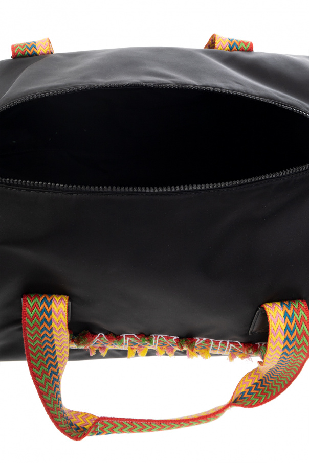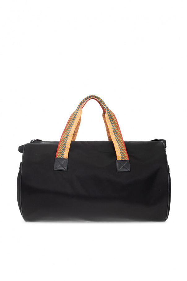 Black ‘Duffle’ holdall bag from Lanvin. Fastened with a two-way zip, this model features a multicolored logo embroidery, side pockets, two multicolored half-round handles, adjustable strap and one internal compartment with one slip pocket.