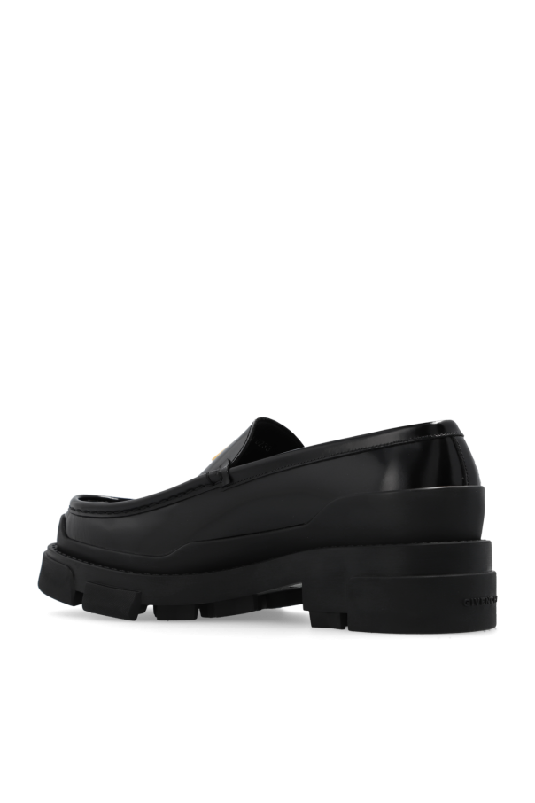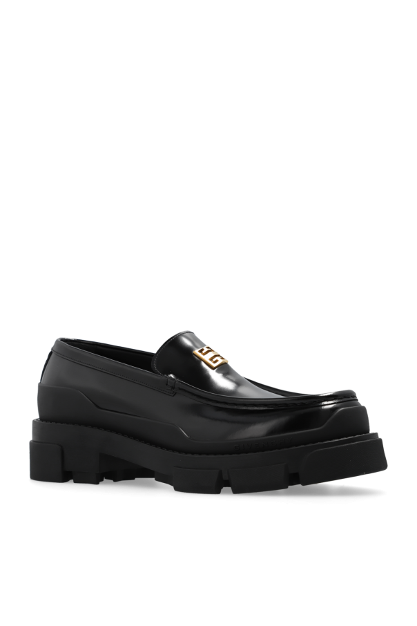 Black ‘Terra’ loafers from Givenchy. Made of patent leather, this model sits on a black rubber sole and showcases gold-tone ‘4G’ logo hardware on the front.