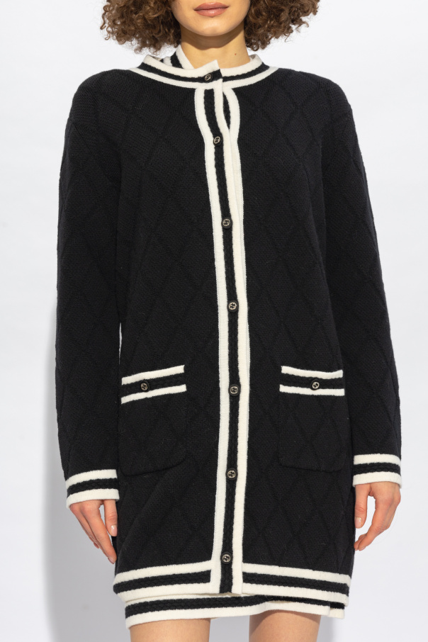 Quilted cardigan in black from Gucci. Made from wool, this style fastens via branded buttons and features a round neck, two slip pockets, long sleeves and ribbing with white stripes on the trims.
