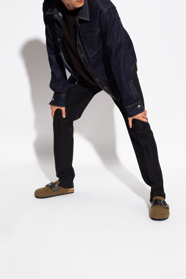 Green, brown and black slides from J.W. Anderson. Crafted from felt, they sit on a black rubber sole and showcase a black strap with a logo-embossed buckle in silver-tone on the upper.