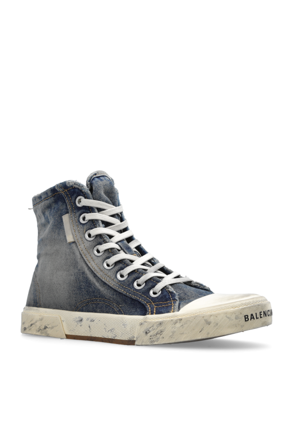 Greyish navy ‘Paris High’ sneakers from Balenciaga. Made of denim, this lace-up pair features a logo, vintage effect and rubber sole in beige and cream.