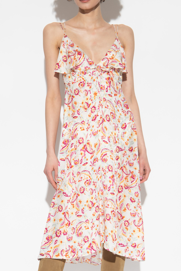 Cream ‘Paysa’ sleeveless dress from Isabel Marant. Crafted from silk blend satin, this design features a hidden zip and hook at the back, multicolored jacquard paisley print, V-neck with tie fastenings and a ruffle as well as double criss-cross shoulder straps.