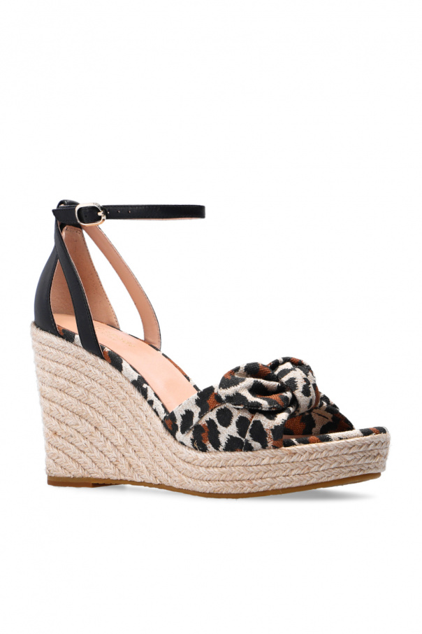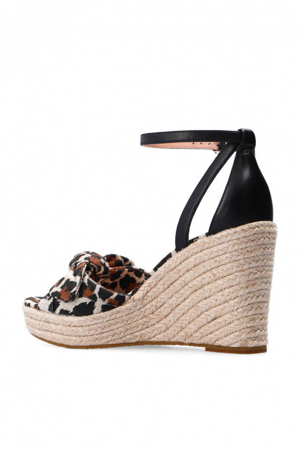 Brown, black and beige ‘Tianna’ wedge sandals from Kate Spade. This pair features an animal motif, ankle strap, decorative tie detail and brown rubber sole.