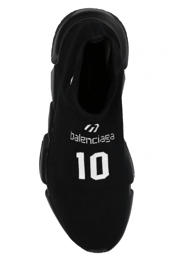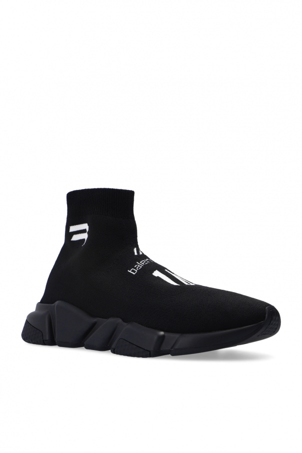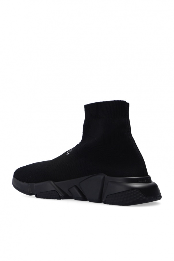 Black ‘Speed Soccer’ sneakers from Balenciaga. Boasting a stretch knit upper with a sock-like cuff, this high-top pair sits on a black rubber sole and showcases an embroidered white logo.