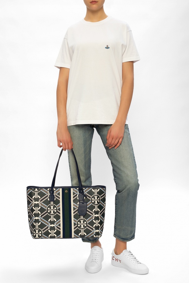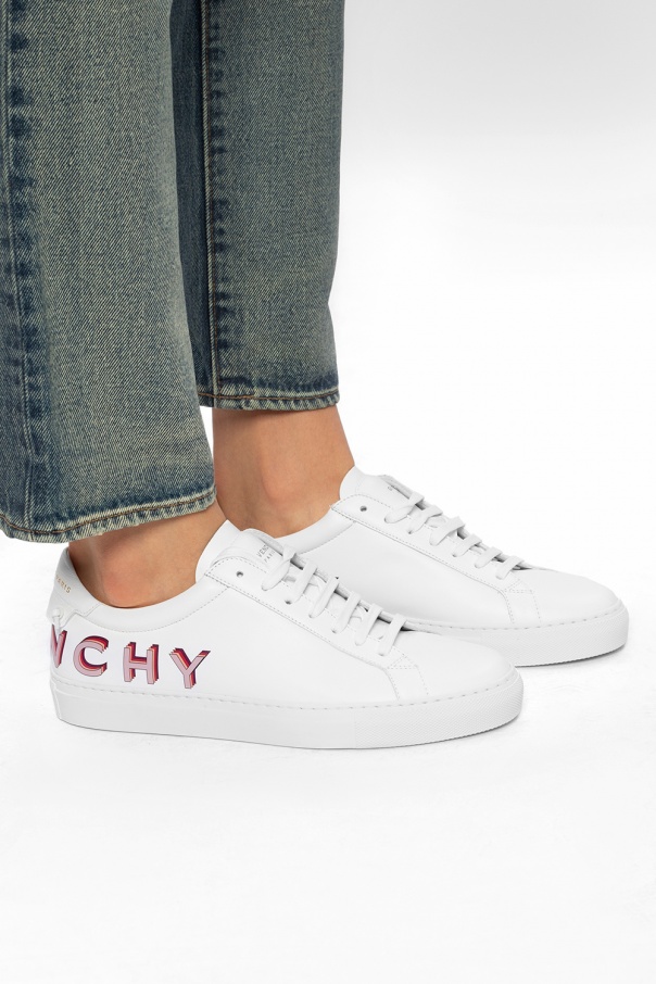 White ‘Urban Street’ sneakers from Givenchy. Crafted from calf leather, this lace-up model features a printed logo pattern in red, orange and purple, an almond toe, decorative knot details at the heel and a white rubber sole.