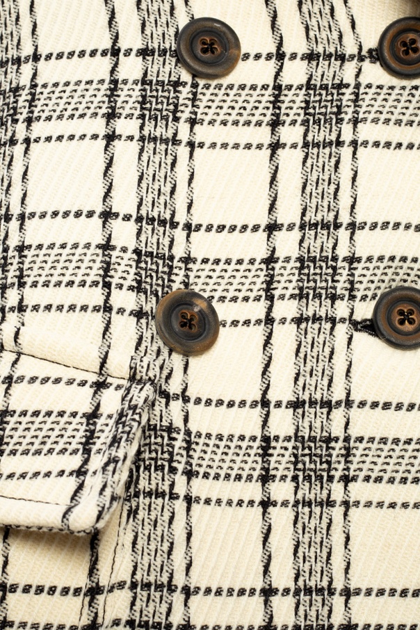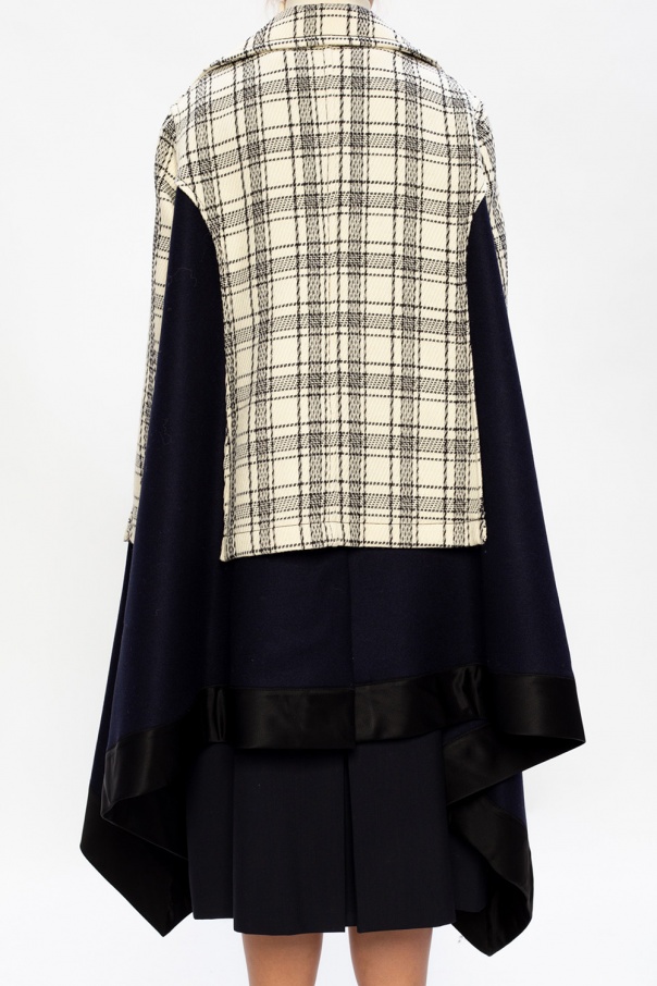 Cream, navy blue and black coat from Marni. Crafted from wool with an asymmetric silhouette, this style features double-breasted design with button fastening, two flapped pockets on the front and single vent on the back.