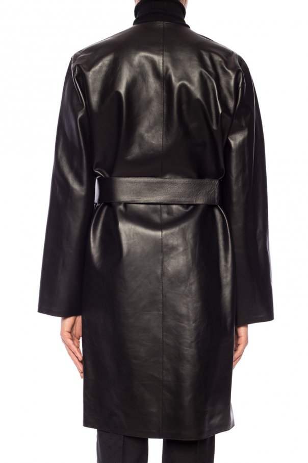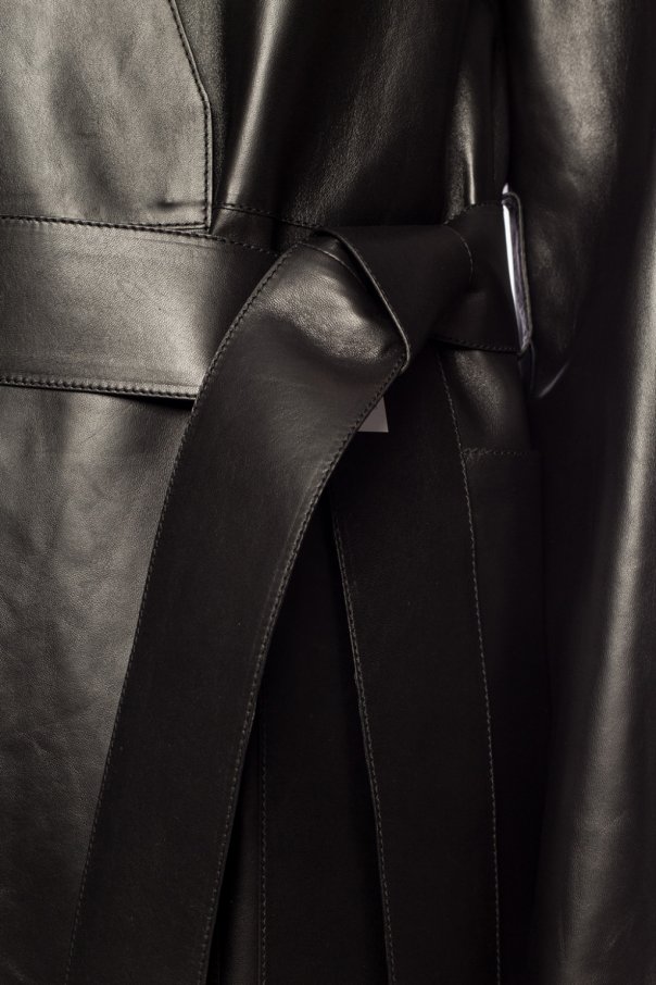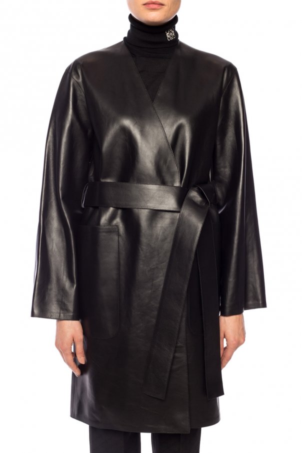 Black coat from Loewe. Made of lamb leather. Buckle belt at the waist. Two slip pockets on the front.