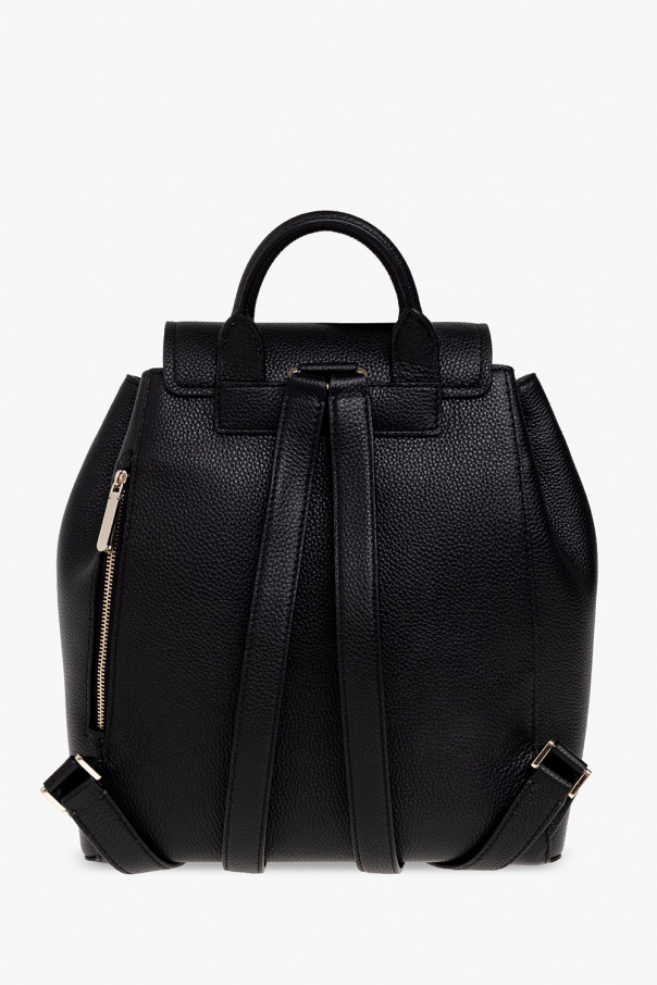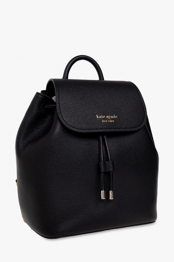 Black backpack from Kate Spade. Crafted from grained leather, this design features a snap fastening, a metal logo plaque on the front, a side zip pocket, a top handle, adjustable shoulder straps, gold-tone metal hardware and a drawstring interior with three slip pockets and one zip pocket.