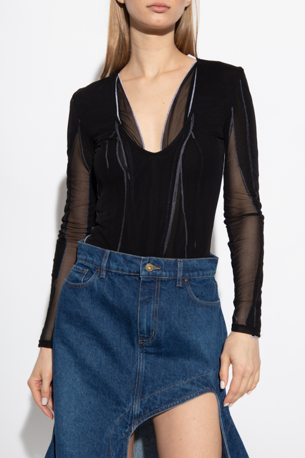 Black sheer body from Y/Project. Fastened with snap buttons, this design features white stitching, decorative trimming, V-neck and long sleeves.
