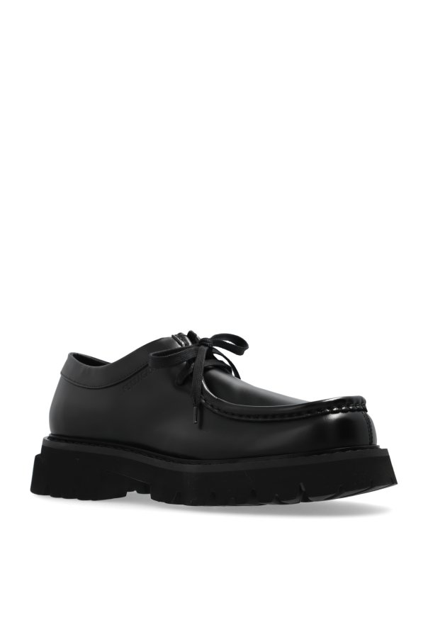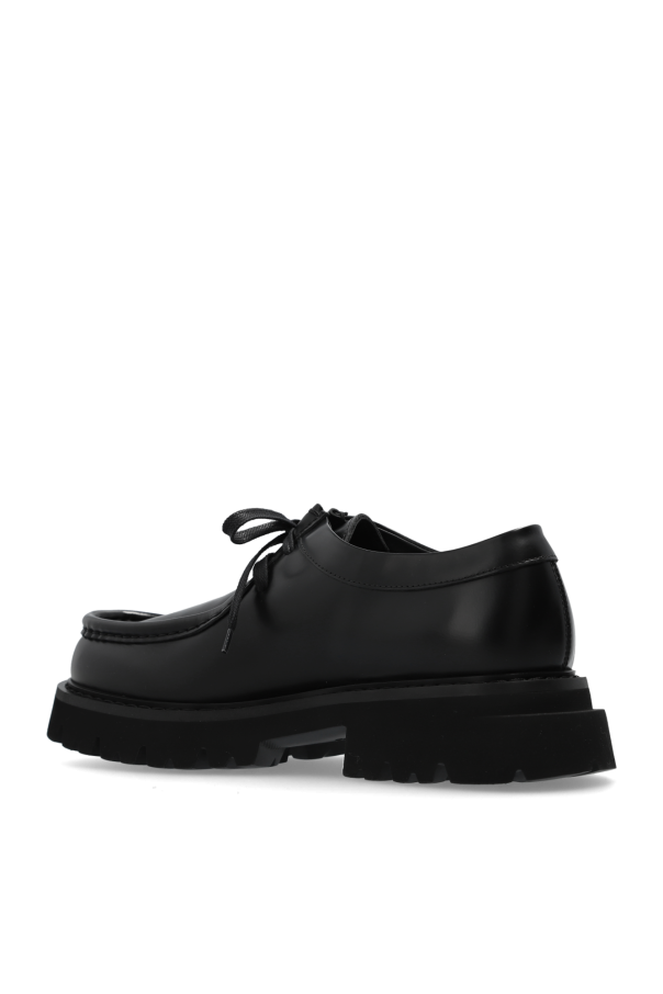 Black ‘Deroy’ shoes from FERRAGAMO. Made of leather, this medium width pair features an embossed logo and a black rubber sole.