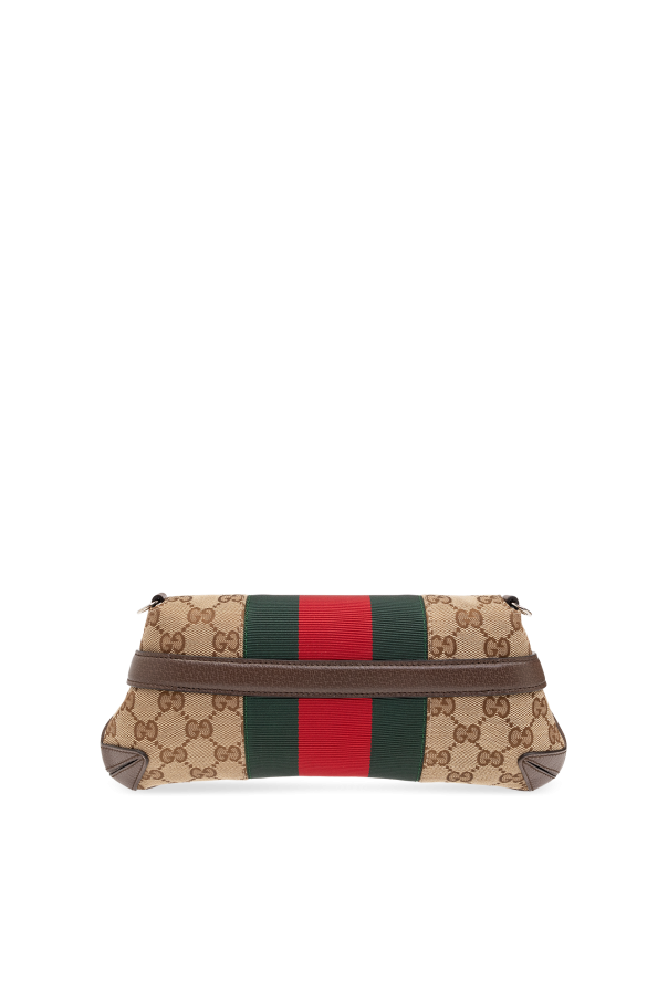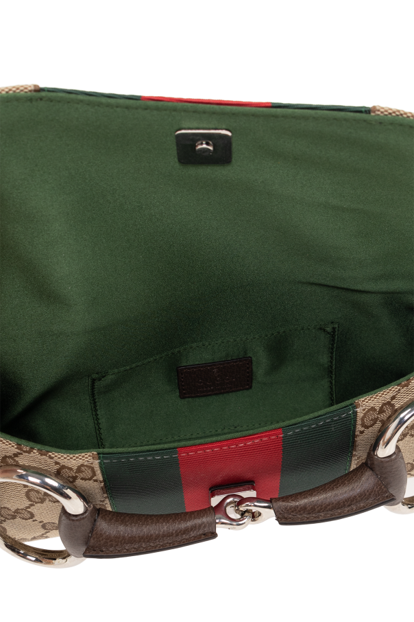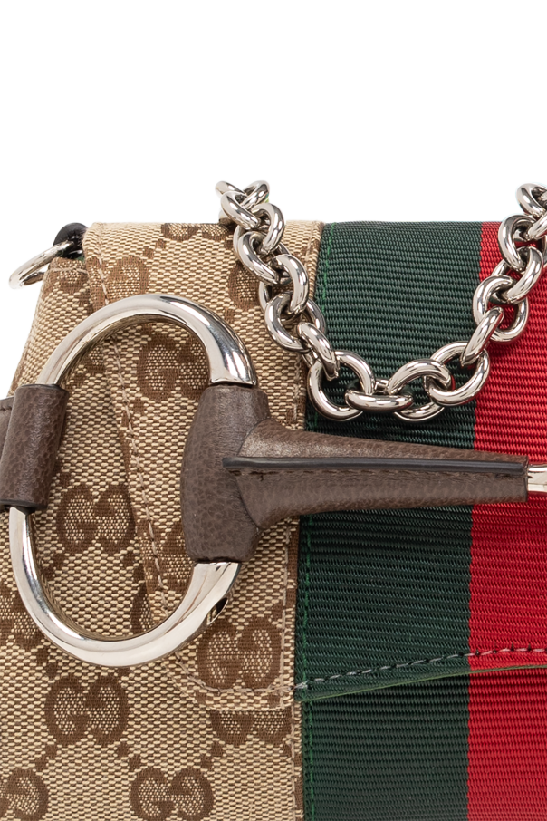 Beige and brown ‘Horsebit Chain’ shoulder bag from Gucci. Crafted from GG Supreme canvas with calf leather trims, this design features a flap with a snap fastening, the brand’s signature oversize horsebit details, green and red Web stripe, detachable strap and chain, silver-tone metal hardware and one internal compartment with one card slot.