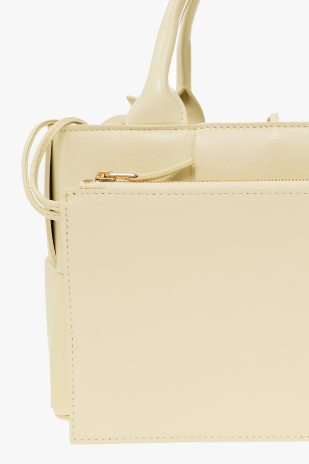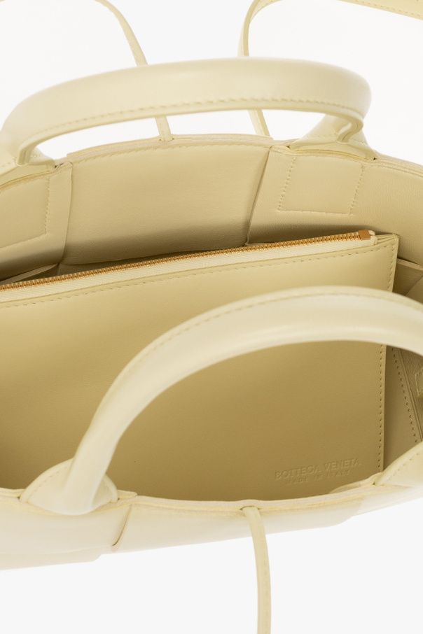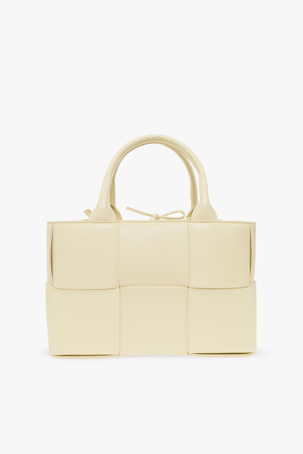 Light yellow ‘Arco Mini’ shopper bag from Bottega Veneta. Crafted from lamb leather with the brand\'s signature ‘Intrecciato’ weave, this design cinches closed with drawcords and features an adjustable strap, two half-round handles and one internal compartment.