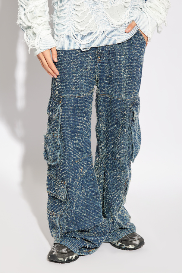 Introducing the \'D-SIRE\' jeans by Diesel, a true testament to innovative design intertwined with classic denim heritage. Crafted from the finest 100% cotton, these jeans blend the timeless appeal of blue denim with an artful display of wear through a subtle blue and white pattern, mimicking the natural aging of the material. While categorized as skinny jeans, the \'D-SIRE\' takes a bold step away from the conventional, featuring a relaxed fit that gently flares towards the bottom, offering a modern twist on the classic silhouette. This unique interpretation is further accentuated by an array of large, strategically placed pockets, adding a layer of practicality and distinctive style. The asymmetrical positioning of some pockets injects an element of originality, setting these jeans apart from the mundane. The authenticity of the \'D-SIRE\' jeans is sealed with a discreet designer logo tag on one of the pockets, symbolizing its exclusive lineage within the Diesel collection. This detail not only signifies quality but also the brand\'s commitment to unique fashion statements. Why Purchase the \'D-SIRE\' Jeans? Exclusive Design: Stand out with the unconventional cargo loose fit and asymmetrical pocket placement. Premium Material: Enjoy the unmatched comfort and durability of 100% cotton denim. Functional Fashion: Benefit from the practicality of six spacious pockets, enhancing both style and utility. Signature Detail: Own a piece of the esteemed Diesel collection, as evidenced by the designer logo tag.