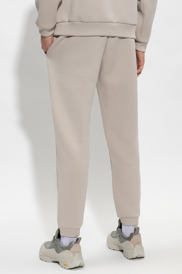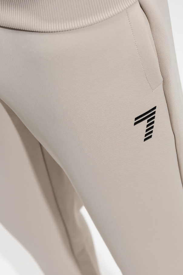 Greyish cream sweatpants from EA7 Emporio Armani. Emblazoned with black logo appliqués on the front and back, this pair features a drawstring waistband, two slip pockets and elasticated cuffs.