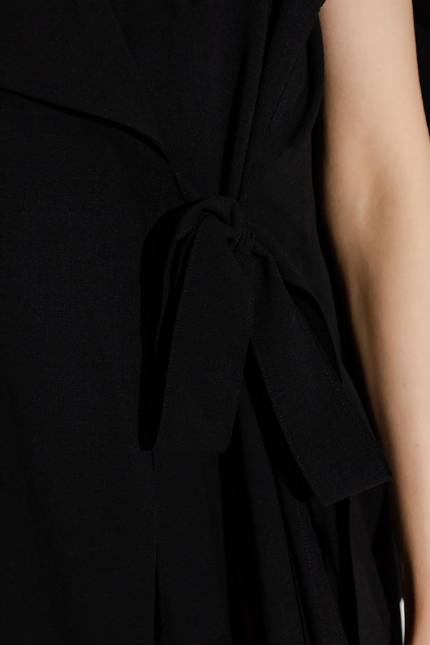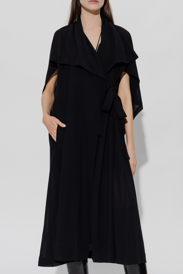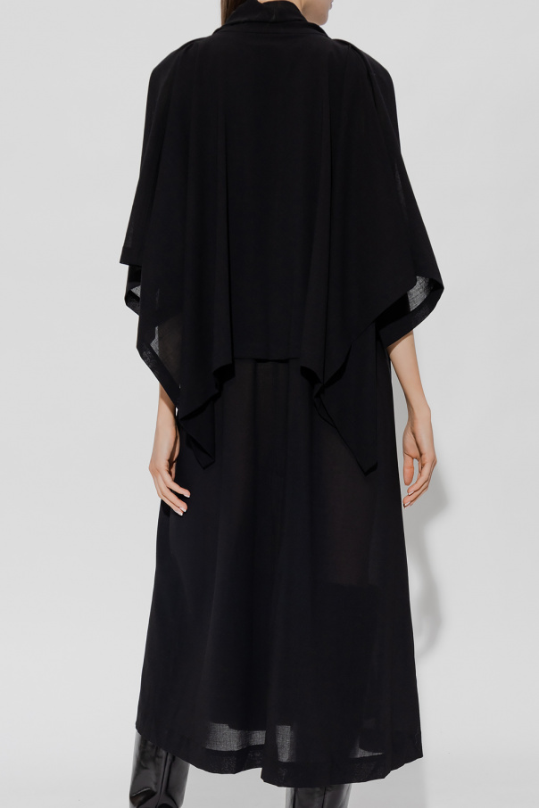 Black coat from Issey Miyake. Crafted from wool, this style features a button fastening, decorative trimming and a double back vent.