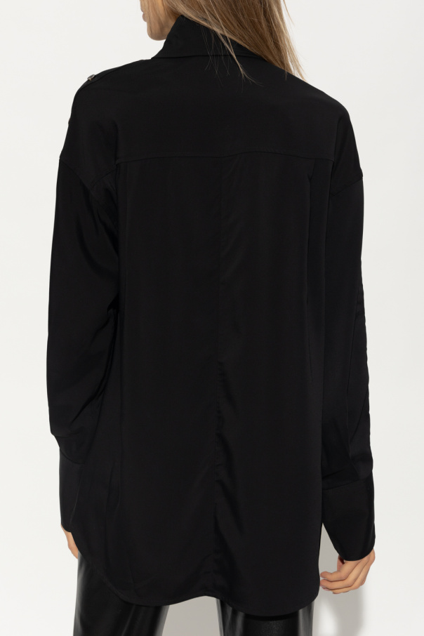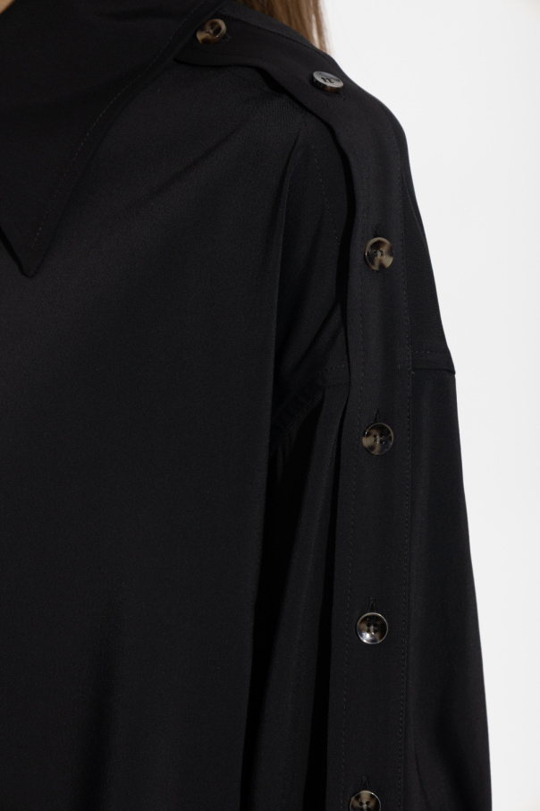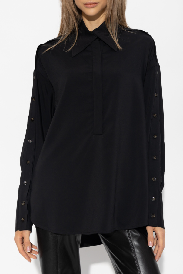 Black top from Proenza Schouler. Cut with a relaxed silhouette, this style features a collar with a hidden button placket and long sleeves with button cuffs.