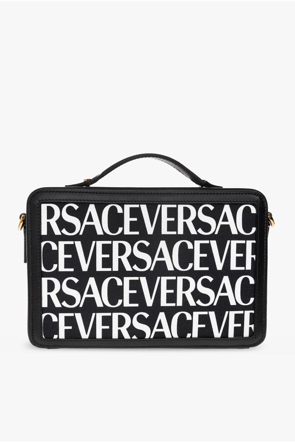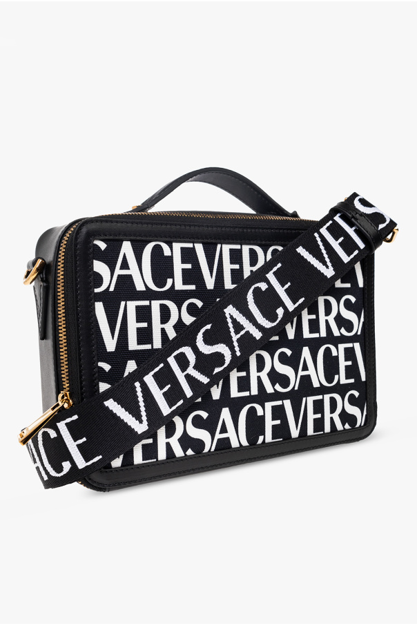 Black shoulder bag from Versace. Crafted from cotton and smooth calf leather, this design secures with a two-way zipper and showcases a white monogram pattern, a half-round handle, gold-tone metal hardware and one internal compartment with one slip pocket and eight card slots.