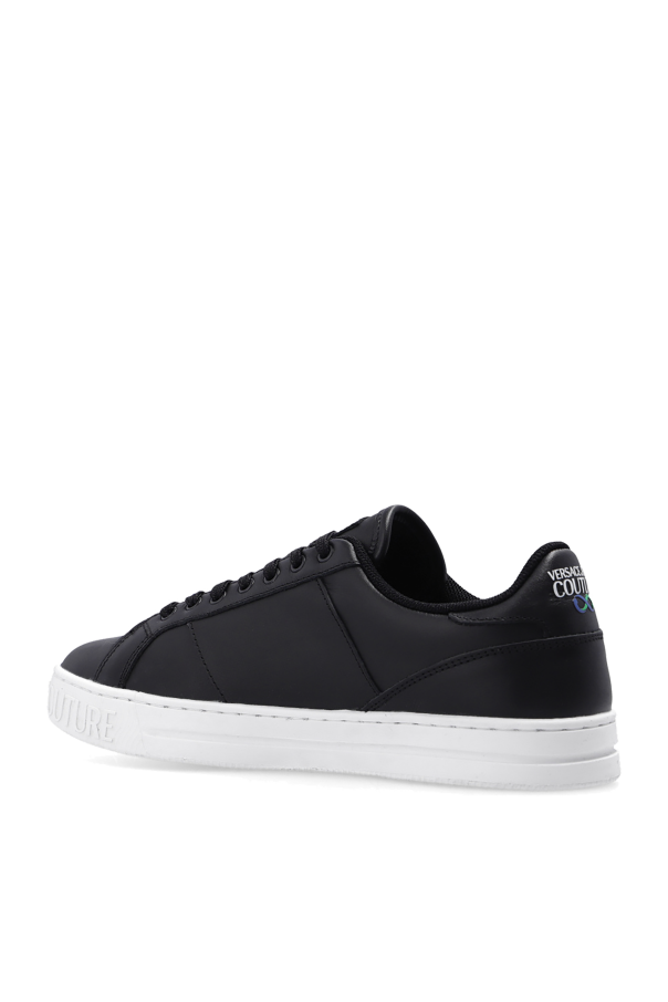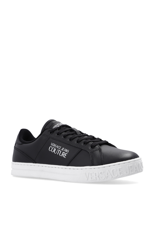 Black sneakers from Versace Jeans Couture. Crafted from leather, this lace-up model sits on a white rubber sole and showcases a white tactile logo detail.