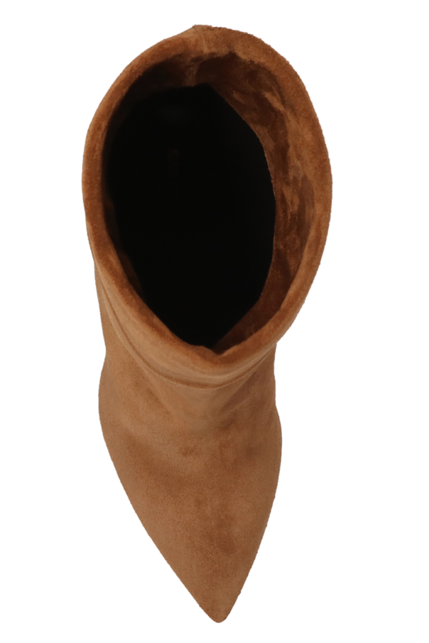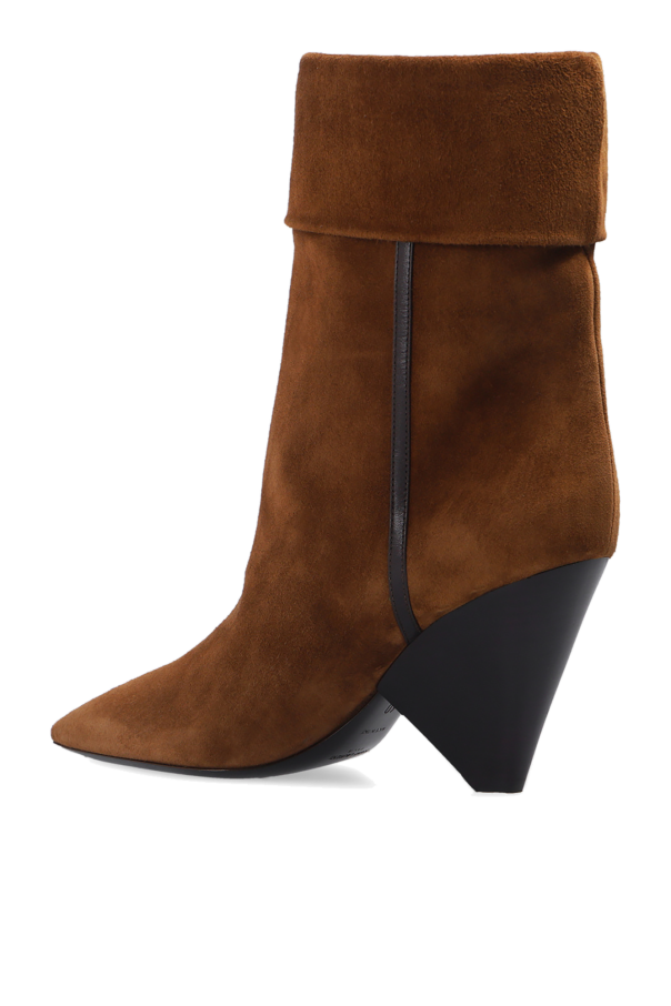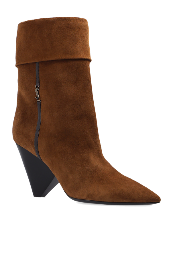 Brown ‘Niki’ heeled ankle boots from Saint Laurent. Crafted from calf suede with a slip-on silhouette, this model features leather detailing, an antiqued gold-tone metal logo plaque and a dark brown leather sole.