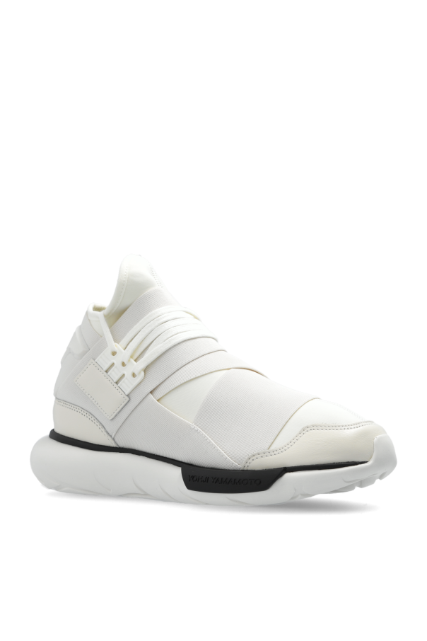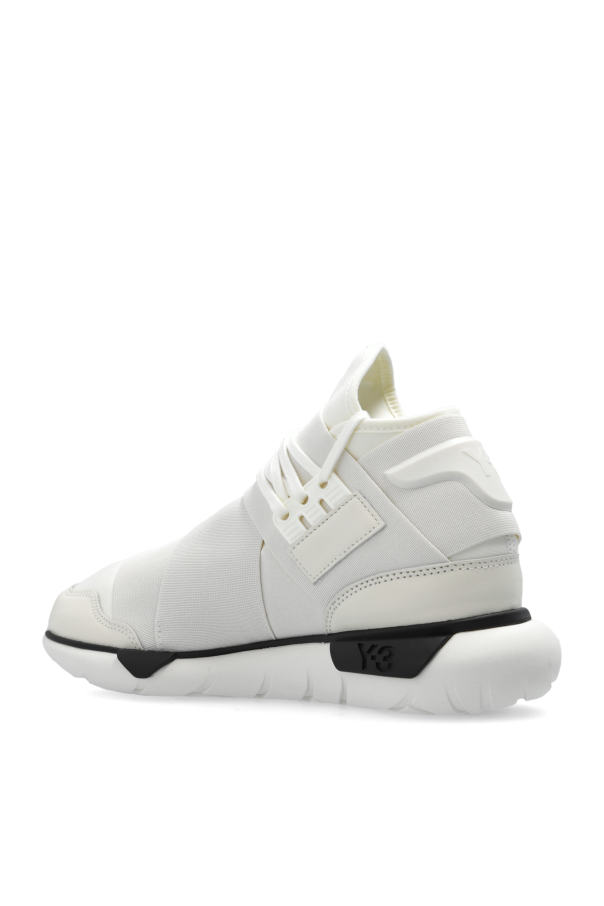White ‘Qasa’ high-top sneakers from Y-3 Yohji Yamamoto. Made from fabric and trimmed with leather elements, this lace-up model sits on a white and black rubber sole and showcases an embossed logo on the side and a rubber application with the brand\'s logo on the back. The upper is embellished with stretchy inserts for a better fit on the sides.