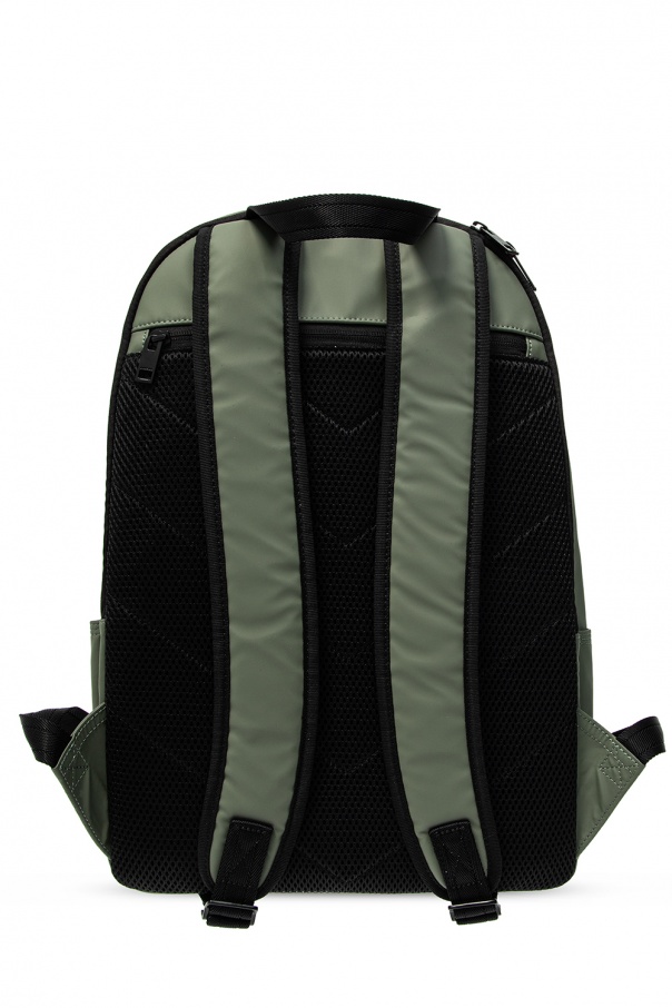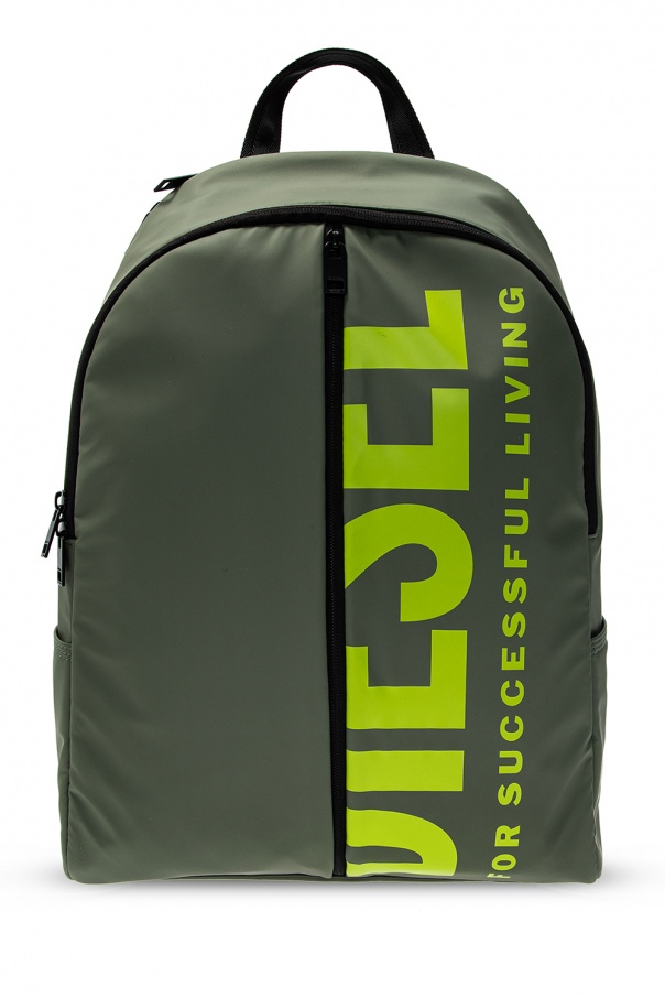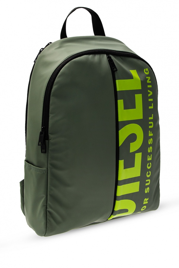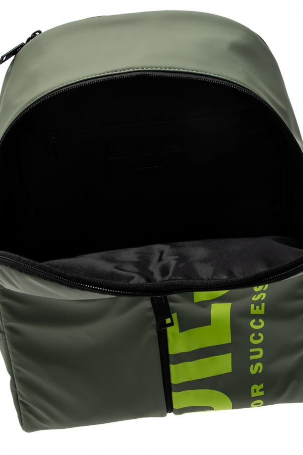Green backpack from Diesel. Crafted from eco-leather, this design showcase light green logo print for the brand recognition. It is complete with zip fastening, adjustable shoulder straps as well as two zipped pockets on the front, two pockets with magnetic closures on the sides and a laptop compartment, which fits most 13\" laptops on the exterior. Its interior houses one compartment and one zipped pocket.